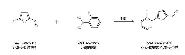 1.通过5-溴-2-呋喃甲醛和2-氟苯硼酸合成5-(2-氟苯基)-呋喃-2-甲醛,收率约84%;