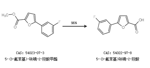 2.通过5-(3-氟苯基)-呋喃-2-羧酸甲酯合成5-(3-氟苯基)呋喃-2-羧酸,收率约96%;