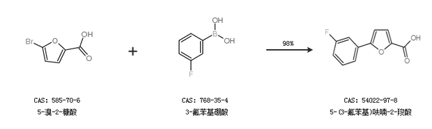 1.通过5-溴-2-糠酸和3-氟苯基硼酸合成5-(3-氟苯基)呋喃-2-羧酸,收率约98%;