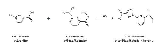 1.通过5-溴-2-糠酸和3-甲氧基羰基苯硼酸合成5-(3-甲氧基羰基苯基)-呋喃-2-羧酸,收率约88%;