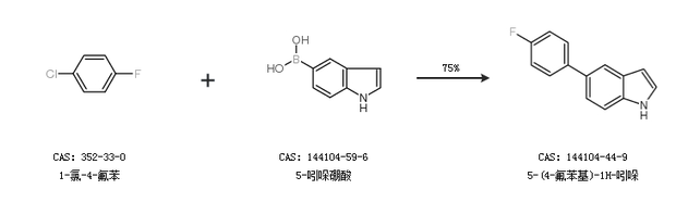 1.通过1-氯-4-氟苯和5-吲哚硼酸合成5-(4-氟苯基)-1H-吲哚,收率约75%;