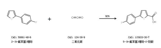 1.通过2-(4-氟苯基)噻吩和二氧化碳合成5-(4-氟苯基)噻吩-2-羧酸,收率约92%;