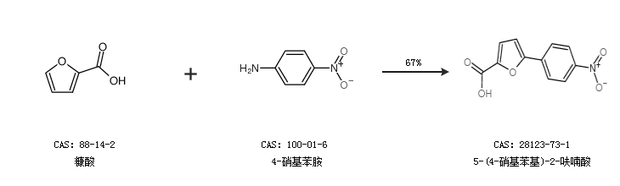 1.通过糠酸和4-硝基苯胺合成5-(4-硝基苯基)-2-呋喃酸,收率约67%;