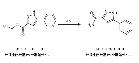 1.通过5-(吡啶-3-基)-1H-吡唑-3-甲酸乙酯合成5-(吡啶-3-基)-1H-吡唑-3-甲酰胺,收率约96%;