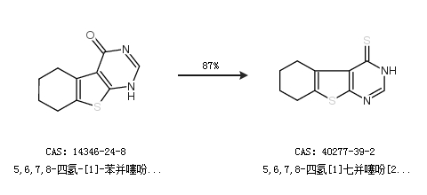 1.通过5,6,7,8-四氢-[1]-苯并噻吩[2,3-d]嘧啶-4(1h)-酮合成5,6,7,8-四氢[1]七并噻吩[2,3-d]嘧啶-4(3h)-硫酮,收率约87%;