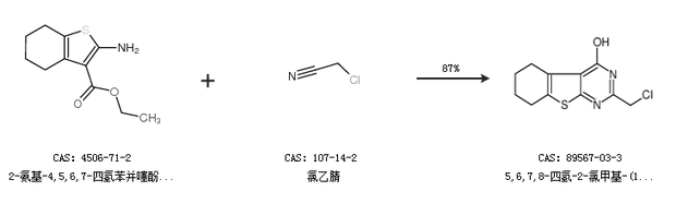 1.通过2-氨基-4,5,6,7-四氢苯并噻酚-3-羧酸乙酯和氯乙腈合成5,6,7,8-四氢-2-氯甲基-(1)苯并噻吩(2,3-d)嘧啶-4(1H)-酮,收率约87%;