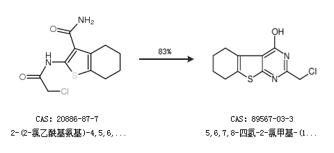 2.通过2-(2-氯乙酰基氨基)-4,5,6,7-四氢苯并[b]噻吩-3-羧酸胺合成5,6,7,8-四氢-2-氯甲基-(1)苯并噻吩(2,3-d)嘧啶-4(1H)-酮,收率约83%;