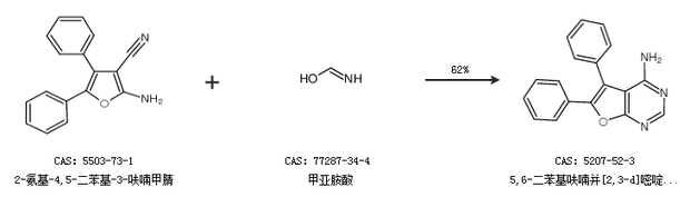1.通过2-氨基-4,5-二苯基-3-呋喃甲腈和甲亚胺酸合成5,6-二苯基呋喃并[2,3-d]嘧啶-4-胺,收率约62%;