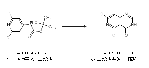 2.通过N-Boc-4-氨基-2,6-二氯吡啶合成5,7-二氯吡啶并[4,3-d]嘧啶-4(3h)-酮
