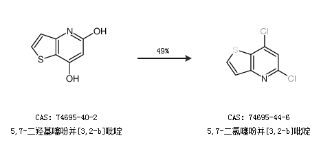 2.通过5,7-二羟基噻吩并[3,2-b]吡啶合成5,7-二氯噻吩并[3,2-b]吡啶,收率约49%;