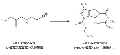 2.通过(2-氰基乙基氨基)-乙酸甲酯合成5-BOC-3-氨基-4,6-二氢吡咯并[3,4-C]吡唑-1-甲酸乙酯