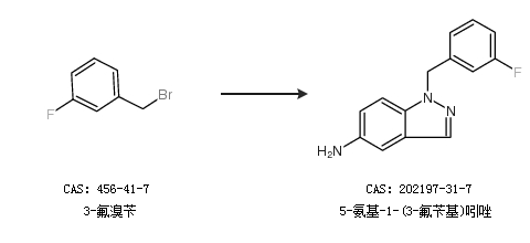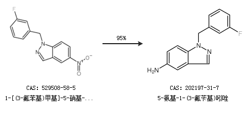 1.通过1-[(3-氟苯基)甲基]-5-硝基-1H-吲唑合成5-氨基-1-(3-氟苄基)吲唑,收率约95%;