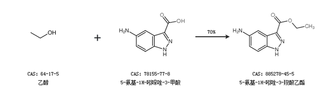 1.通过乙醇和5-氨基-1H-吲哚唑-3-甲酸合成5-氨基-1H-吲唑-3-羧酸乙酯,收率约70%;