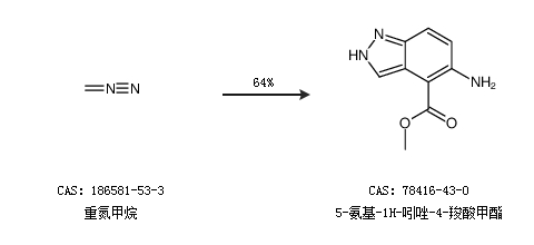 1.通过重氮甲烷合成5-氨基-1H-吲唑-4-羧酸甲酯,收率约64%;