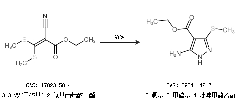 1.通过3,3-双(甲硫基)-2-氰基丙烯酸乙酯合成5-氨基-3-甲硫基-4-吡唑甲酸乙酯,收率约47%;