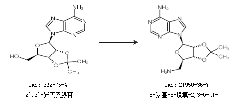 英文别名 9-(6-aminomethyl-2,2-dimethyl-tetrahydro-furo[3,4-d] [1,3]dioxol-4-yl)-9H-purin-6-ylamine;9-((3aR,4R,6R,6aR)-6-aminomethyl-2,2-dimethyltetrahydrofuro[3,4-d][1,3]dioxol-4-yl)-9H-purin-6-ylamine;9-((3aR,4R,6R,6aR)-6-(aminomethyl)-2,2-dimethyltetrahydrofuro[3,4-d][1,3]dioxol-4-yl)-9H-purin-6-amine;5''-Amino-5''-deoxy-2'',3''-O-(1-methylethylidene)-adenosine;2'',3''-O-isopropylidene-5''-amino-5''-deoxy adenosine;5''-amino-5''-deoxy-2'',3''-O-isopropylideneadenosine;