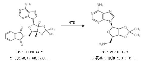 1.通过2-(((3aR,4R,6R,6aR)-6-(6-氨基-9H-嘌呤-9-基)-2,2-二甲基四氢呋喃并[3,4-d][1,3]二氧代-4-基)甲基)异吲哚啉-1,3-二酮合成5-氨基-5-脱氧-2,3-O-(1-甲基亚乙基)-腺苷酸,收率约97%;