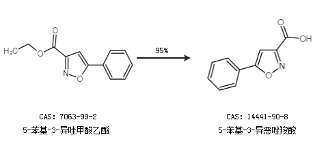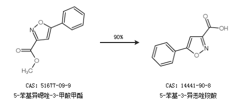 2.通过5-苯基异噁唑-3-甲酸甲酯合成5-苯基-3-异恶唑羧酸,收率约90%;