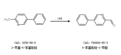 1.通过2-甲基-5-苯基吡啶合成5-苯基吡啶-2-甲醛,收率约14%;