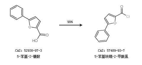 1.通过5-苯基-2-糠酸合成5-苯基呋喃-2-甲酰氯,收率约99%;