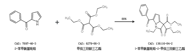 1.通过2-苯甲酰基吡咯和甲烷三羧酸三乙酯合成5-苯甲酰基吡咯-2-甲烷三羧酸三乙酯,收率约88%;