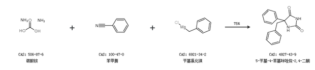 1.通过碳酸铵、苯甲腈和苄基氯化镁合成5-苄基-4-苯基咪唑烷-2,4-二酮,收率约75%;