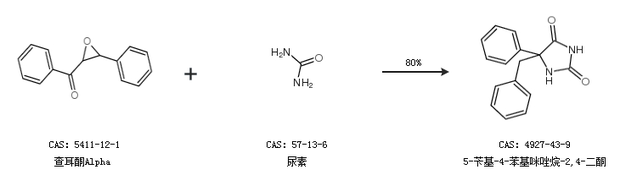 2.通过查耳酮Alpha和尿素合成5-苄基-4-苯基咪唑烷-2,4-二酮,收率约80%;