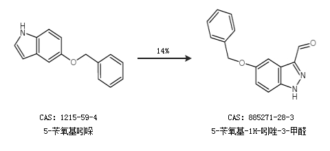 1.通过5-苄氧基吲哚合成5-苄氧基-1H-吲唑-3-甲醛,收率约14%;