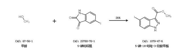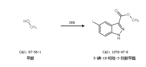 2.通过甲醇合成5-碘-1H-吲唑-3-羧酸甲酯,收率约26%;