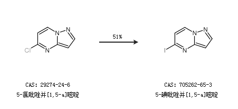 1.通过5-氯吡唑并[1,5-a]嘧啶合成5-碘吡唑并[1,5-a]嘧啶,收率约51%;