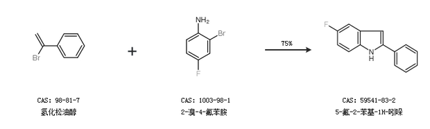 2.通过氢化松油醇和2-溴-4-氟苯胺合成5-氟-2-苯基-1H-吲哚,收率约75%;