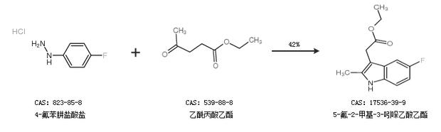 2.通过4-氟苯肼盐酸盐和乙酰丙酸乙酯合成5-氟-2-甲基-3-吲哚乙酸乙酯,收率约42%;