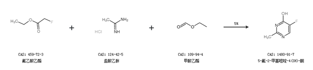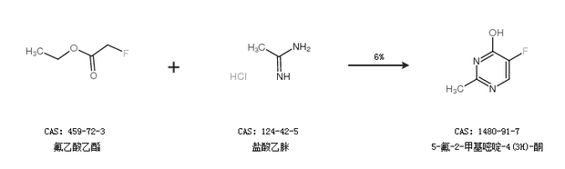 2.通过氟乙酸乙酯、盐酸乙脒和甲酸乙酯合成5-氟-2-甲基嘧啶-4(3H)-酮,收率约5%;