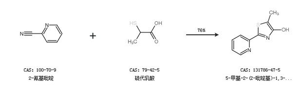 1.通过2-氰基吡啶和硫代乳酸合成5-甲基-2-(2-吡啶基)-1,3-噻唑-4-醇,收率约76%;