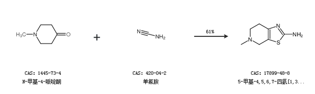 1.通过N-甲基-4-哌啶酮和单氰胺合成5-甲基-4,5,6,7-四氢[1,3]噻唑并[5,4-C]吡啶-2-胺,收率约61%;