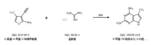 1.通过2-氨基-4-甲基-3-呋喃甲酰腈和盐酸胍合成5-甲基-7H-吡咯并[2,3-D]嘧啶-2,4-二胺,收率约65%;