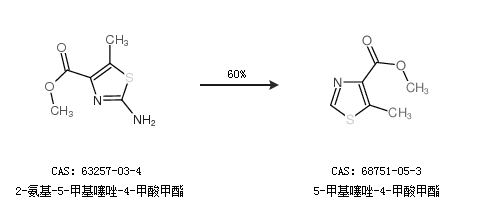 1.通过2-氨基-5-甲基噻唑-4-甲酸甲酯合成5-甲基噻唑-4-甲酸甲酯,收率约60%;