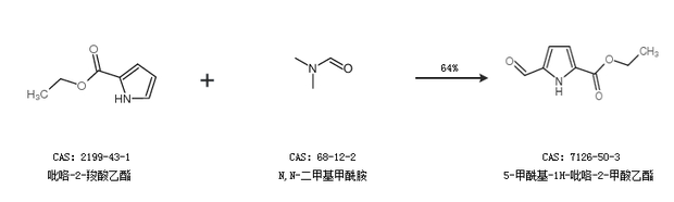 2.通过吡咯-2-羧酸乙酯和N,N-二甲基甲酰胺合成5-甲酰基-1H-吡咯-2-甲酸乙酯,收率约64%;