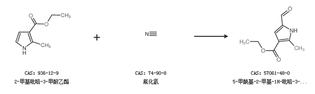 2.通过2-甲基吡咯-3-甲酸乙酯和氰化氢合成5-甲酰基-2-甲基-1H-吡咯-3-羧酸乙酯