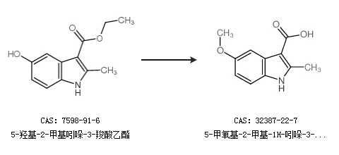1.通过5-羟基-2-甲基吲哚-3-羧酸乙酯合成5-甲氧基-2-甲基-1H-吲哚-3-羧酸