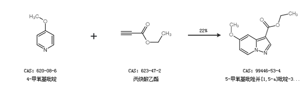 1.通过4-甲氧基吡啶和丙炔酸乙酯合成5-甲氧基吡唑并[1,5-a]吡啶-3-羧酸乙酯,收率约22%;