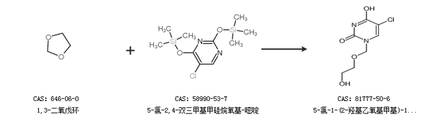 1.通过1,3-二氧戊环和5-氯-2,4-双三甲基甲硅烷氧基-嘧啶合成5-氯-1-(2-羟基乙氧基甲基)-1H-嘧啶-2,4-二酮
