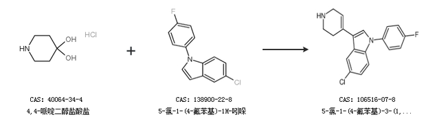 2.通过4,4-哌啶二醇盐酸盐和5-氯-1-(4-氟苯基)-1H-吲哚合成5-氯-1-(4-氟苯基)-3-(1,2,3,6-四氢吡啶-4-基)-1H-吲哚