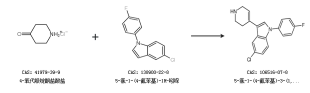 1.通过4-氧代哌啶酮盐酸盐和5-氯-1-(4-氟苯基)-1H-吲哚合成5-氯-1-(4-氟苯基)-3-(1,2,3,6-四氢吡啶-4-基)-1H-吲哚