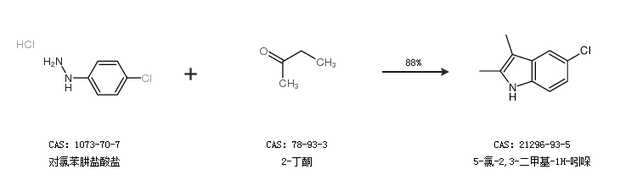 2.通过对氯苯肼盐酸盐和2-丁酮合成5-氯-2,3-二甲基-1H-吲哚,收率约88%;