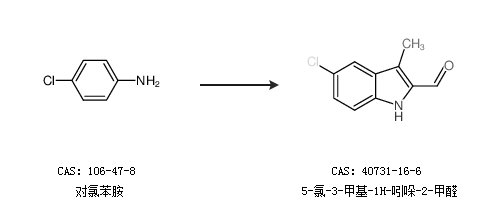 1.通过对氯苯胺合成5-氯-3-甲基-1H-吲哚-2-甲醛