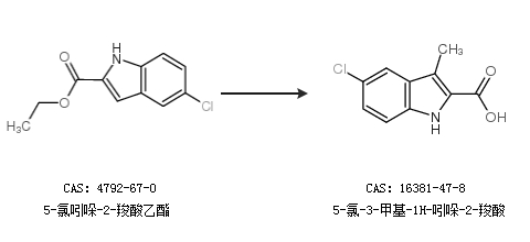 2.通过5-氯吲哚-2-羧酸乙酯合成5-氯-3-甲基-1H-吲哚-2-羧酸