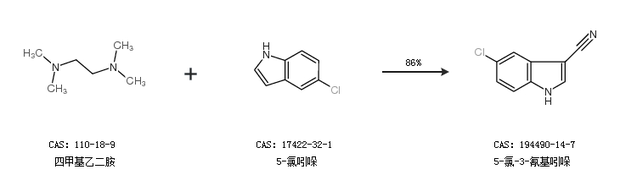 1.通过四甲基乙二胺和5-氯吲哚合成5-氯-3-氰基吲哚,收率约86%;