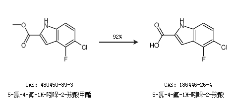 2.通过5-氯-4-氟-1H-吲哚-2-羧酸甲酯合成5-氯-4-氟-1H-吲哚-2-羧酸,收率约92%;
