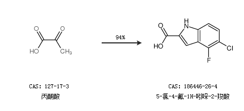 1.通过丙酮酸合成5-氯-4-氟-1H-吲哚-2-羧酸,收率约94%;